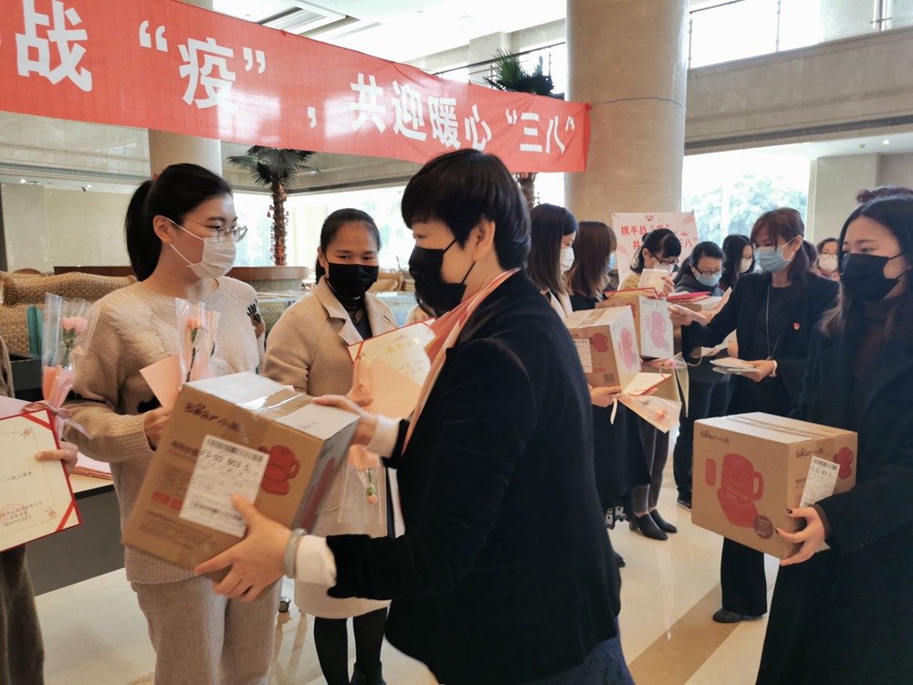 隨后總裁兼CEO孫亦農先生、首席財務官裴紅蘭女士、首席營銷官紀偉如女士、內審中心副總、銀鷺食品黨支部書記林麗霜女士為獲得一等獎的職工們送上鮮花、禮品。儀式簡單而溫馨,雖然大家都戴著口罩,但口罩擋不住她們的美麗,面對疫情,我們云擁抱、云互動,祝福是遠程的,心卻是如此貼近,這個3.8節(jié)過得比往年更有意義。